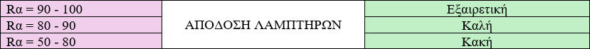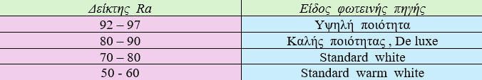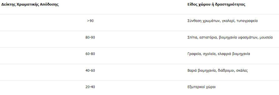 Η Χρωματική απόδοση, η οποία εκφράζεται ως μια τιμή από 0 έως 100 στον Δείκτη χρωματικής απόδοσης (CRI),περιγράφει πώς μια πηγή φωτός κάνει το χρώμα ενός αντικειμένου να φαίνεται στα ανθρώπινα μάτια και πόσο καλά διαχωρίζονται οι λεπτές παραλλαγές στις χρωματικές αποχρώσεις.Μπορείτε να βρείτε το Ra στις προδιαγραφές του φωτιστικού. Όσο μεγαλύτερος είναι ο αριθμός τόσο λιγότερη είναι η παραμόρφωση των χρωμάτων.Πρότυπη φωτεινή πηγή με δείκτη χρωματικής απόδοσης 100 θεωρείται ο ήλιος.Η υψηλότερη τιμή του δείκτη χρωματικής απόδοσης είναι 100 και μπορεί να είναι και αρνητική για κάποιες πηγές φωτός.Οι λαμπτήρες νατρίου χαμηλής πίεσης που χρησιμοποιούνται κυρίως για τον φωτισμό δρόμων, έχουν αρνητικό δείκτη χρωματικής απόδοσης.Οι λαμπτήρες φθορίου έχουν cri που κυμαίνεται από το 50 για τις απλές λάμπες έως και το 90 για τις λάμπες φθορίου τρι-φωσφορικού τύπου.Οι λάμπες LED έχουν δείκτη πάνω από 80 ενώ κάποιοι κατασκευαστές έχουν επιτύχει CRI έως και 98.Πηγή φωτός με CRI ίσο με 0 Ra είναι ένα μονοχρωματικό φως, δηλαδή ενός χρώματος. Σε μια τέτοια πηγή φωτός είναι αδύνατον να προσδιοριστεί το χρώμα του φωτιζόμενου αντικειμένου. Θεωρείται ότι το CRI που ισούται με 100 Ra αντιστοιχεί στο φως της ημέρας (ηλιακό). Υπό αυτό το φως τα χρώματα των αντικειμένων που φωτίζονται αποδίδονται με πιο φυσικό τρόπο. Το φάσμα του ηλιακού φωτός είναι συνεχές σε όλα τα χρώματα που εκπέμπονται έντονα. Μεταξύ των τεχνητών πηγών φωτός CRI, στο επίπεδο του 100 είναι ο φωτισμός με πυράκτωση, δηλαδή οι λαμπτήρες με πυράκτωσης και οι λαμπτήρες αλογόνου.Γιατί στον φωτισμό των δρόμων ο αρνητικός δείκτης είναι επιθυμητός;Γιατί αποδίδοντας στα αντικείμενα μια κίτρινη απόχρωση και όχι την πραγματική, η νυχτερινή οδήγηση καθίσταται πιο ξεκούραστη