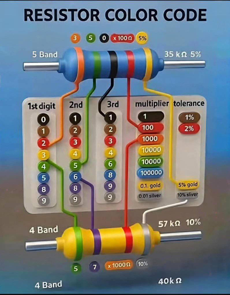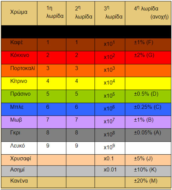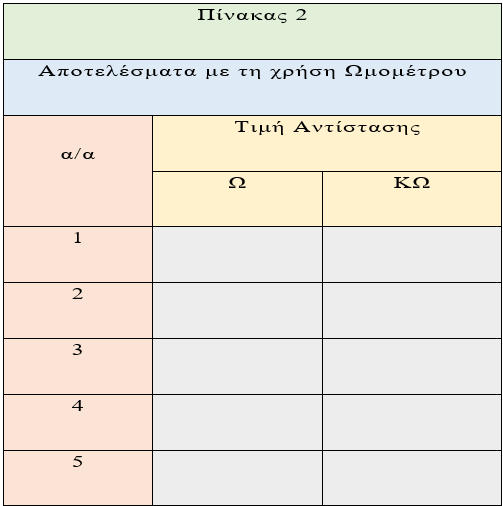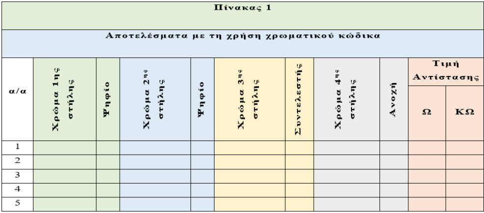 Μέτρηση αντίστασης με κώδικα χρωμάτωνΑ. ΘΕΩΡΗΤΙΚΟ ΜΕΡΟΣΟ χρωματικός κώδικας αποτελεί μέσο για τον υπολογισμό της ωμικής αντίστασης καθώς και της ανοχής της. Οι αντιστάσεις χρησιμοποιούν τον χρωματικό κώδικα για να γίνει εύκολη η ανάγνωση τους.Ηηλεκτρικήαντίσταση(R)είναιέναηλεκτρολογικό/ηλεκτρονικόεξάρτηματοοποίοχρησιμοποιείταισεδιάφορακυκλώματαγιατονέλεγχοτηςροής του ρεύματος. Η μονάδα μέτρησης της ηλεκτρικής αντίστασης στο Διεθνές Σύστημα Μονάδων (SI), είναι το Ωμ(Ohm).Οιτιμέςτωναντιστάσεωνπαρουσιάζουνανοχήσεσχέσημεαυτέςπουυπολογίζονταιλαμβάνονταςυπ’όψηταχρώματατους.Έτσι,οι κατασκευαστές, έχουν προσθέσει μια τέταρτη ζώνη χρώματος, την ανοχή, για να δηλώσουν την ακρίβεια της αντίστασης.Σεμίααντίστασημετέσσεριςχρωματικέςλωρίδες(όπωςοπαραπάνωαντιστάτης),οιτρειςπρώτεςλωρίδεςβρίσκονταισχετικάκοντάημίαστην άλληκαικαθορίζουντηντιμήτηςαντίστασης,ενώητέταρτηπουβρίσκεταιλίγομακρύτερααπότιςυπόλοιπεςτρειςυποδηλώνειτηνανοχήτηςτιμής τηςαντίστασης.Τοχρώματηςλωρίδαςτηςανοχήςείναισυνήθωςχρυσαφίήασημί.Ανδενυπάρχειτέταρτηλωρίδαηανοχήτουαντιστάτηθεωρείται ίση με 20%. Γιαναβρούμετηντιμήμίαςαντίστασης,τοποθετούμετηναντίστασηέτσιώστεηλωρίδατηςανοχήςναβρίσκεταιτελευταία(δηλαδήδεξιά).Τότετο πρώτοκαιτοδεύτεροχρώμα(πρώτη-δεύτερηλωρίδα)αντιστοιχούνσταδύοπρώταακέραιαψηφίατηςαντίστασης.Τοχρώματηςτρίτηςλωρίδας είναιπολλαπλασιαστήςκαιαντιστοιχείστοπαράγοντα(δύναμητου10)μετονόποιοπρέπειναπολλαπλασιαστούνταψηφίατωνδύοπρώτων λωρίδων. Ο αριθμός που προκύπτει είναι η τιμή της αντίστασης, ενώ βλέποντας την τέταρτη και τελευταία λωρίδα σημειώνουμε και την ανοχή της. Β. ΠΟΡΕΙΑ ΕΡΓΑΣΙΑΣΧρησιμοποιήστε πέντε διαφορετικές αντιστάσεις και υπολογίστε την τιμή τους με βάση τον χρωματικό κώδικαΣυμπληρώστε τον Πίνακα1Μετρήστε την τιμή των ίδιων αντιστάσεων με ωμόμετροΣυμπληρώστε τον Πίνακα 2Γ. ΠΙΝΑΚΑΣ ΜΕΤΡΗΣΕΩΝΔ. ΣΥΜΠΕΡΑΣΜΑΤΑΔραστηριότητα: Υπάρχει αντιστοίχιση μεταξύ των τιμών του Πίνακα 1 και του Πίνακα 2;